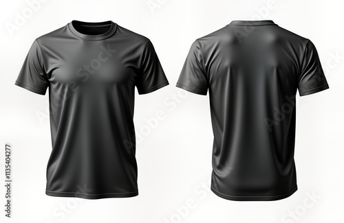 Blank dark gray t-shirt mockup front, back views. Isolated on white background. Provides template for design. Suitable for fashion design. Versatile clothing item. Casual wear. Suitable for print
