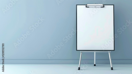 blank flip chart on stand against light blue wall, ideal for presentations and brainstorming sessions. clean design enhances focus and creativity