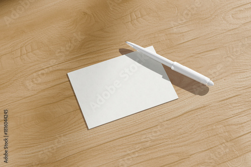 Blank Postcard Mockup on Wooden Desk with Pen – Stationery Design Template