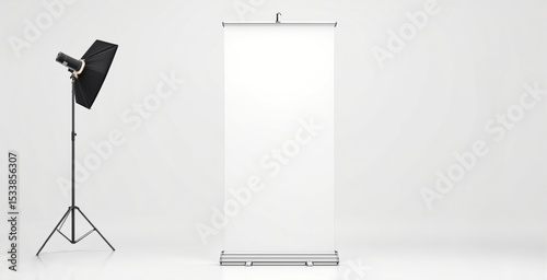 banner, racked, studio, concept, light, minimal, white, empty, blank, poster, template, background, display, advertising, marketing, promotion, business, commercial, clean, modern, presentation, signage, vertical, photo, tripod, metal, professional, layout, object, equipment, product, showcase, indoor, scene, setup, isolated, shot, bright, illumination, message, design, communication, ai, generative, illustration