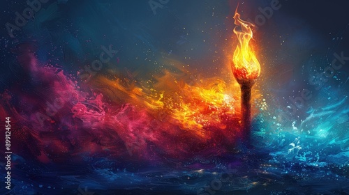 Blazing flame in an Olympic torch against a blurred sports arena background, with space for text placement.