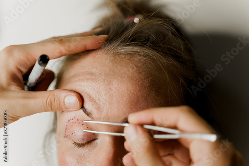 Blepharoplasty markup close-up on the face before the plastic surgery operation for modifying the eye region of the face in medical clinic. 2 doctors do plastic cosmetic operation