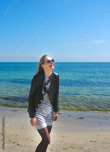 Blonde girl have fun on the beach. Young smiling woman is dressed in striped dress in black leather jacket.