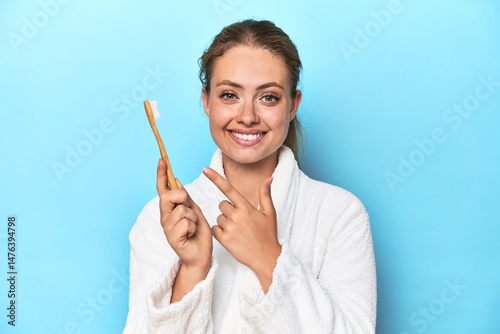 surprised, expression, showing, finger, confident, space, smiling, product, amazed, facial, charming, copy space, point, friendly, gesture, delighted, cheerful, copy, happy, presenting, young, caucasian, blond, bathrobe, toothbrush, blue, studio, dental, health, hygiene, oral, care, teeth, female, clean, brush, wellness, morning, routine, toothpaste, fresh, healthy, smile, bathroom, personal