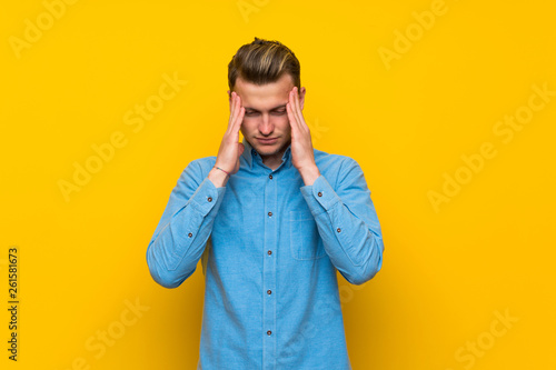 Blonde man over isolated yellow wall with headache