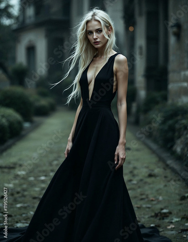 Blonde woman black beauty dress