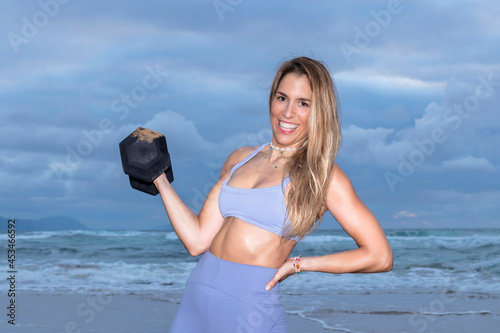 blonde woman doing weights on the seashore on a cloudy day smiling at camera dressed in blue sportswear