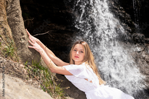 blonde woman in white dress lying on a tree with a waterfall behind