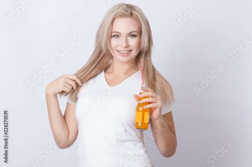 juice, fashion, bottle, beverage, thirst, sexy, girl, beauty, soda, drink, stylish, tube, style, sweet, design, female, funny, lovely, pretty, attractive, bright, hipster, cool, charmer, blond, portrait, studio, water, cute, youth, background, charming, beautiful, adult, young, fun, delicate, woman, mineral, vitamin, orange, white, t-shirt, favor, coiffure, tasty, diet, figure, orange