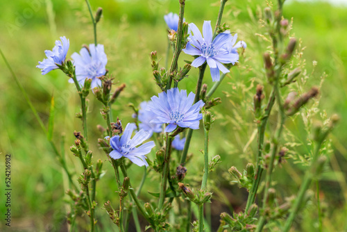 Blooming chicory, common chicory Cichorium intybus. Coffee substitute. Used in confectionery, canning production. Close up.