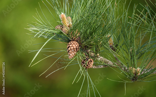 Blooming pine cones on branches isolated on a smooth green bokeh background.