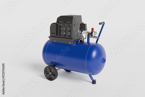 blue air compressor is shown on a white surface, equipped with a black motor on top. This tool is useful for powering various devices in workshops, garages, and construction sites. 3d render