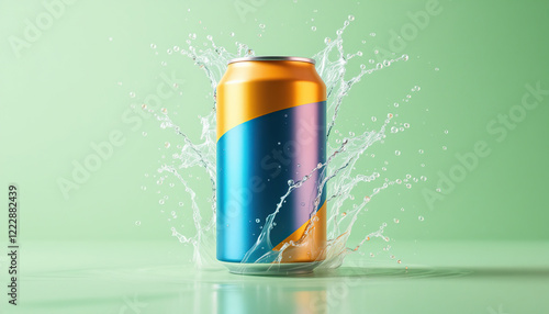 can, drink, beverage, soda, splash, water, blue, gold, colours, metal, aluminium, design, cardboard box, product, refreshing, cool, liquid, droplet, background, texture, surface, clean, shiny, vibrant, modern, style, commercial, advertising, marketing, image, photo, graphic, illustration, visual, concept, energy, summer, thirst, quenching, bubbly, fizz