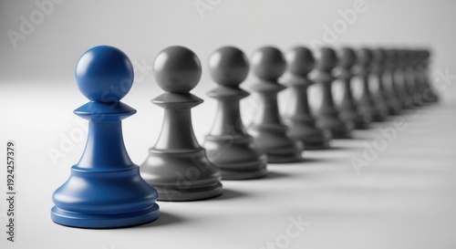 Blue and gray pawn figures in a row symbolizing leadership and strategy