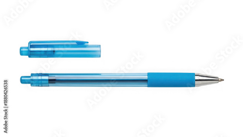 Blue ballpoint pen with cap on white background