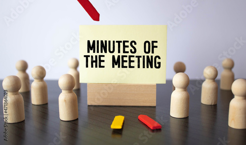 blue board with text MINUTES OF THE MEETING on the office background