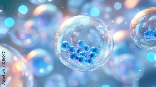 Blue Cells in Transparent Spheres, Glowing Bokeh Background