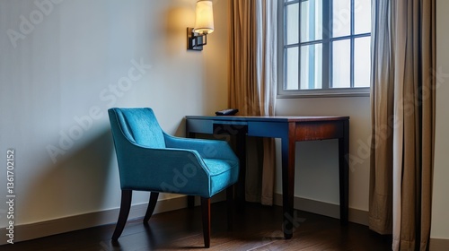 room, desk, chair, window, corner, interior, cosy, light, peaceful, elegant, modern, furniture, blue, wooden, decor, home, office, study, stylish, comfortable, workspace, relaxing, office space, contemporary, comfort, quiet, luxury, simple, functional, clean, design, detail, calm, relaxation, beautiful