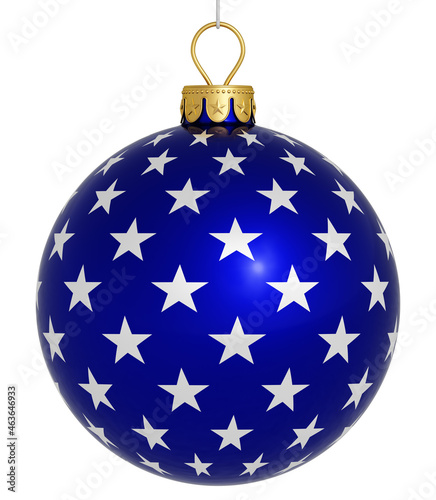 Blue Christmas balls with white stars isolated on white. USA. America. Luxury template for Christmas banner, cards or poster. Holiday decor. 3D render. Isolated.