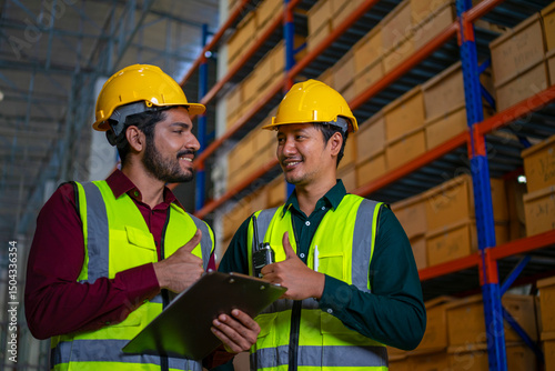 thumb up, chart, paper, document, paperwork, rack, colleague, working class, employee, warehouse, work tool, occupation, working, inspector, merchandise, shipping, people, industry, professional occupation, man, industrial building, talking, shelf, skill, cardboard box, teamwork, co-worker, factory, two people, male