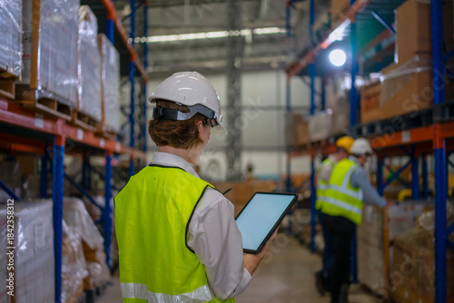 warehouse, rack, colleague, working class, employee, work tool, occupation, working, inspector, merchandise, shipping, people, industry, industrial building, talking, shelf, cardboard box, teamwork, co-worker, man, woman, factory, delivering, quality control, male, female, three people