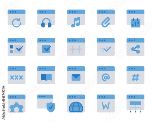 Blue color icons set for Webpages, websites, browser, window.