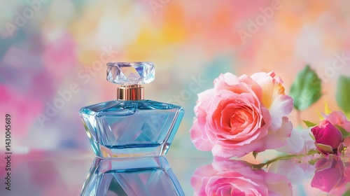 Blue crystal perfume bottle paired with rose, mirrored on high-gloss surface in studio setting