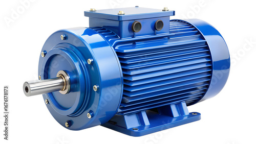 Blue electric motor isolated on transparent background, a powerful industrial machine for energy generation and automation in manufacturing