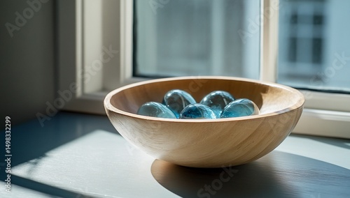 blue glass, wooden bowl, sunlight, window light, home decor, window sill, sunbeam, calm, serenity, peaceful, tranquil, relaxing, spa, wellness, zen, meditation, blue, teal, glasses, wood, natural light, interior design, stylish, elegant, simple, clean, bright, object, still life, closeup, detail, texture, light, shadow, decoration, accessory