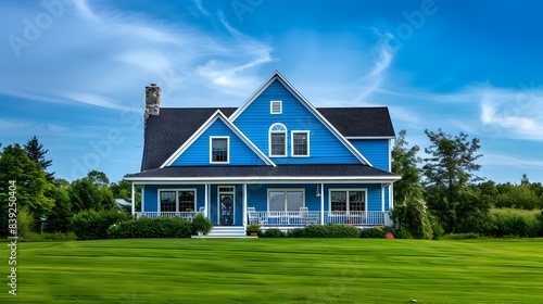 blue, house, white, trim, green, lawn, clear, sky, exterior, residential, peaceful, home, environment, airy, calm, suburban, bright, inviting, picturesque, landscape, vibrant, property, neat, paint, architectural, sunny, artistic, cosy, serene, summer, stylish, habitat, friendly, living, visual, urban, crisp, harmonic, construction, cheerful, shelter, natural, domestic, structure, aesthetic, scenic