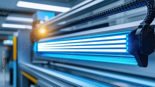 Blue Illuminated Industrial Equipment with LED Lighting in a Modern Manufacturing Facility
