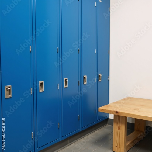 Blue metal lockers with wooden bench provide practical storage in locker area