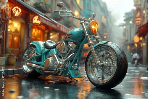 street, luxury, chrome, motorcycle, vintage, alleyway, avocation, cruiser, lighting, travel, headlamp, urban, handlebar, night time, rain, glistening, harley davidson, city landscape, vehicle, wheel, custom, speed, tire, transportation, ride, exhaust, engine, blue