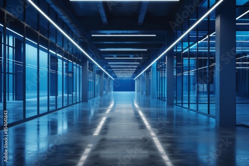 blue office corridor, concrete floor, loft-style windows, continuous ceiling lights, business and financial design theme, spacious interior concept