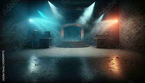 blue orange spotlights shine on stage floor in dark room, idea for background backdrop, music hall or studio, Generative Ai