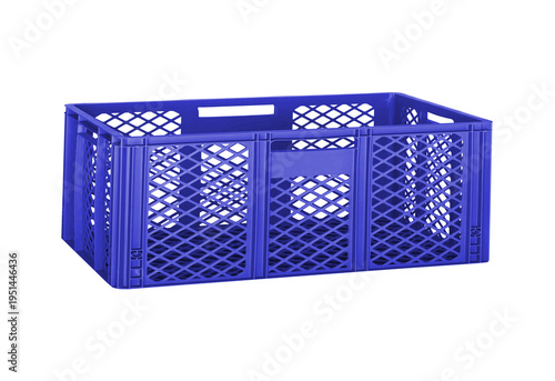 Blue plastic crate with diamond pattern design and handles isolated on transparent background