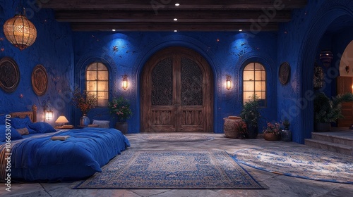 blue, room, interior, bed, bedchamber, window, window, door, wooden, arch, arched, doorway, ceiling, wall, lamp, lighting, lantern, rug, carpet, pillow, bedding, furniture, plant, vase, night, dark, cosy, decorated, ornate, home, house, design, style, pattern, floor, stone, tile