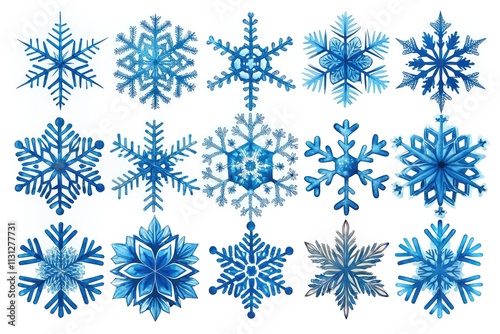 Blue snowflake collection featuring minimalist illustrations ideal for New Year designs, frozen motifs, and perfect for holiday decorations on a clean white background.