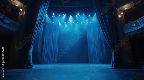 stage, theatre, curtain, blue light, performance, venue, show, spotlight, backstage, architecture, entertainment, ambience, dramatic, illuminated, production, seating, atmosphere, art, design, theatrical, scenic, artistry, colourful, event, showtime, ready, scene, exhibition, look, presentation, illumination, drama, artistic, empty, waiting, quiet, calm, preparatory, moment, view, setting, perspective