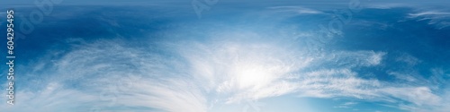 Blue summer sky panorama with Cirrus clouds. Seamless hdr spherical 360 panorama. Sky dome in 3D visualization, sky replacement for aerial drone 360 panoramas. Climate and weather change.