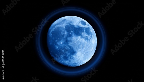Blue Super Moon Glowing With Blue Halo Isolated On Black Background