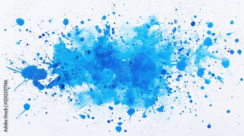 Blue watercolor splash and abstract paint droplets on white background with Copy Space for text placement
