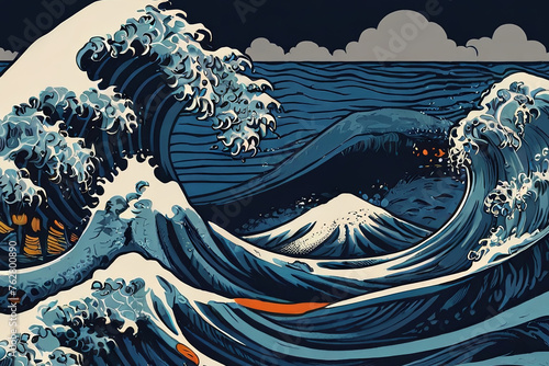 Blue wave background. Screenprint poster style artwork. Risograph print adds unique texture.