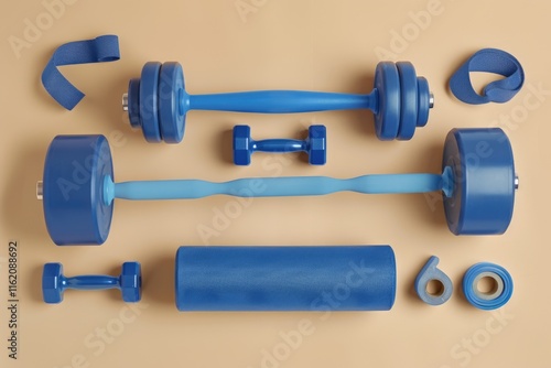 Blue workout equipment set on beige background. Dumbbells fitness tape roller. Flat lay top view.