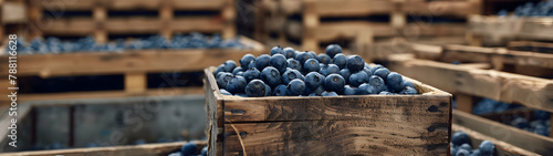 Blueberries harvested in wooden boxes in a warehouse. Natural organic fruit abundance. Healthy and natural food storing and shipping concept.