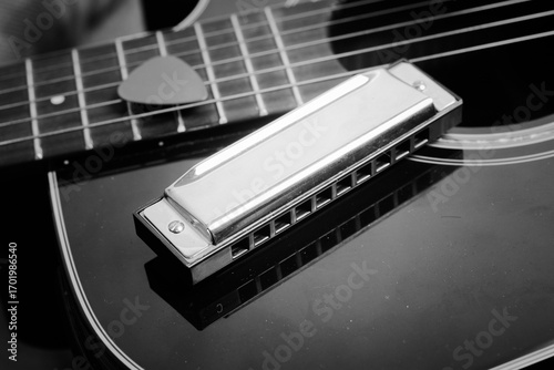 Blues harp on Folk Guitar Body with guitar pick