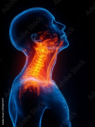 neck, pain, throat, blue, skin, man, male, human, figure, orange, glow, chest, closeup, side, view, head, shoulder, animated, style, realistic, detailed, texture, shadow, depth, medicals, anatomy, discomfort, ache, symptom, condition, inflammation, health care, concept, illustration, three-dimensional, render, lighting, effect, facial, expression, suffering, distress, clinical, diagnosis, treatment, doctor, patient, hospital