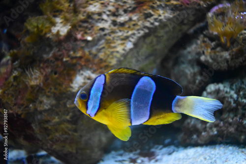 Blue-yellow fish with blue stripes, underwater life