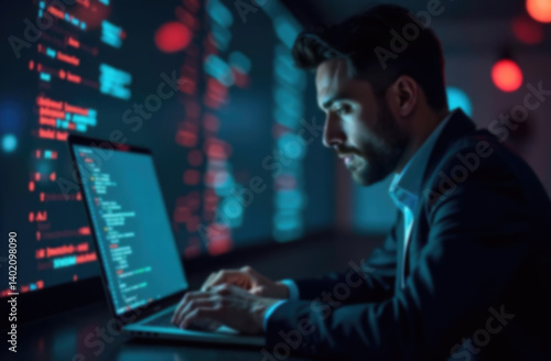 Blur background of AI, Artificial Intelligence, AI generated content Concept. Artist Man using AI Art to generate image content.