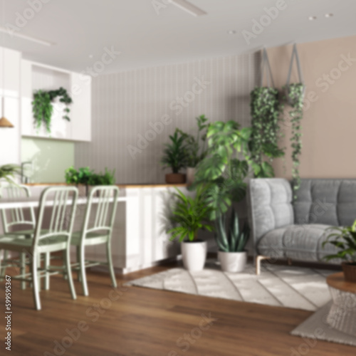 Blurred background, home garden, dining and living room. Island with chairs, parquet and mani houseplants. Urban jungle interior design. Biophilia concept
